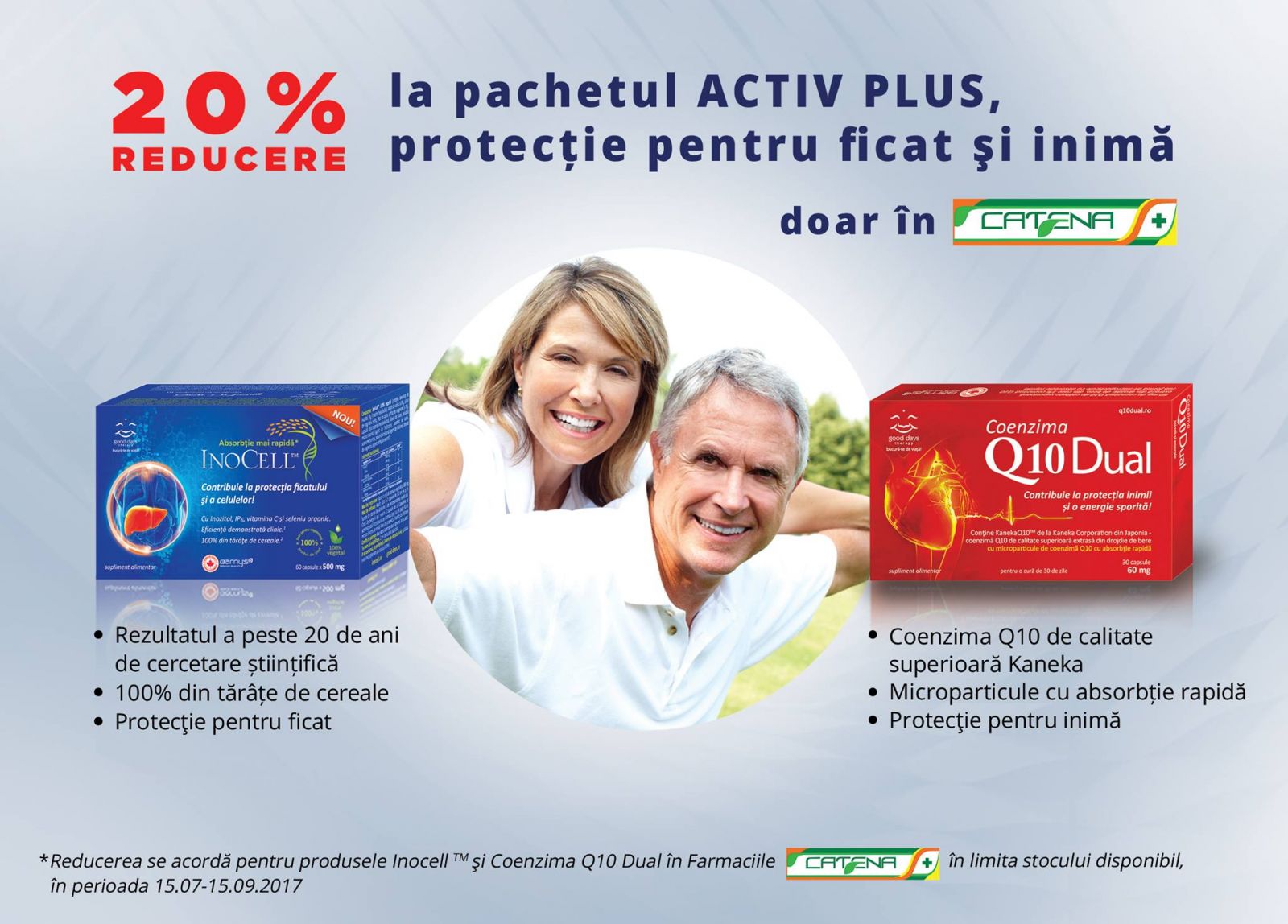 *Reducerea se acordă pentru produsele Coenzima Q10 Dual și InoCell™, în famaciile Catena, în limita stocului disponibil, în perioada 15.07.– 15.09.2017.